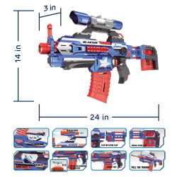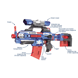With 2 magazine clips (with a 6 dart and 10 dart capacity) a clip-on scope and an extendable body, this blaster is the perfect toy for any space. Find the perfect collection of parts you like and get to work having fun! Indoor or outdoor - hours of fun and exercise guaranteed! This attack blaster comes with foam darts with soft rounded tips for a realistic look! Run wild as you chase your friends (or the dog) around the yard. Create teams and play classic games or make up new games! You’ll have such a blast! Guaranteed Smiles! – 1 Year Warranty Dimple is a company that loves to please its customers and your purchase is secured with a 1 year comprehensive warranty! We know that our products will be a ton of fun in any toy room but if for any reason you are not completely satisfied with this product, please contact a customer care representative. Our customers are our number one priority! |