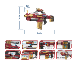 • DIMENSIONS & QUALITY: 14 x 24 x 3 in. Made of durable plastic this blaster is sturdy, ready for action and sure to keep up with your child! The motor has a built in anti-overheating feature that cuts off the power in case of blockage.