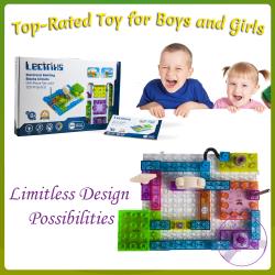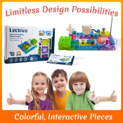 An interactive, light up circuit blocks set that moves, makes noise, and creates 120 unique electronic creations! The only thing kids love more than building with blocks is building with blocks that also make noise and light up! Introducing the Dimple Electronic Circuit Blocks Set, a light up circuitry system that features a small, electric motor that lets kids create fans, flying spinners, light projects, sounds, and so much more! With 120 unique projects that they can create and a ton of great accessories that make each individual creation truly unique, boys and girls will love getting to build toys that actually move and make noise! Product Details: