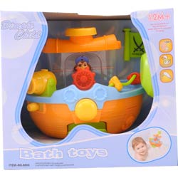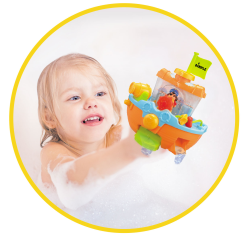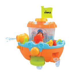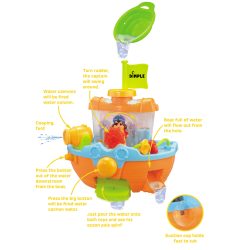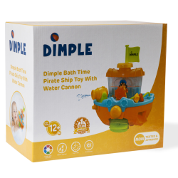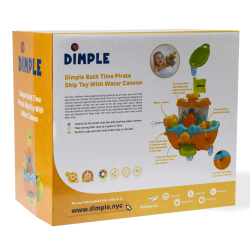 Ahoy ye matey! Your little scallywags will want to drop anchor and stay in the tub to play when they're pretending to be a pirate on the high seas with the dimple bath time pirate ship with a water cannon! The colorful pirate ship bath set has several exciting features! Your child can fill the pirate ship with water using the included boat scoop - when the water begins to overflow, the sides open and release the water! Turn the rudder to watch the captain sway back and forth as if he were really at sea! The pirate ship easily and securely attaches to the tub wall or any smooth surface via suction cups in the back. Pressing the small button under the cannon turns the paddle on, allowing water to slowly escape and turn the paddle. Pressing the large button fires a stream of water from the cannon that your little ones aged twelve months and up will love! Make bath time fun with this exciting bath set from Dimple! Guaranteed Smiles! 1 Year Warranty