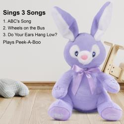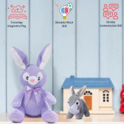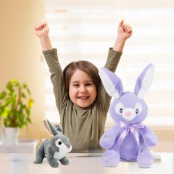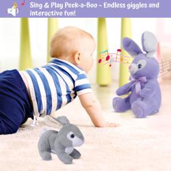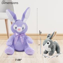 Interactive Play Modes: Meet Bella the Purple Bunny and the Grey Baby Rabbit, two delightful plush toys that offer endless entertainment. Bella features two engaging play modes: press her right foot to hear a friendly rendition of ‘Do Your Ears Hang Low,’ or press her left foot for a playful game of peek-a-boo where Bella hides her eyes. Baby bunny, while not animated, provides classic cuddles and comfort, making both toys ideal for interactive play and sensory development. Perfect for bunny toys for kids and toddler stuff.